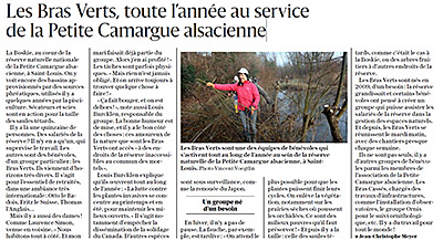 Fil d'Ariane :Accueil › Actualités › Les Bras Verts, toute l’année au service de la Petite Camargue alsacienne Les Bras Verts, toute l’année au service de la Petite Camargue alsacienne Publié le 21/01/2026 Actualités Article dans le supplément ICI on AGIT du journal l’Alsace Autres photos des Bras-vert Écoutez le reportage sur l’élevage du saumon à la Petite Camargue alsacienne https://www.radiofrance.fr/franceinter/podcasts/regarde-la-france/regarde-la-france-du-mercredi-21-janvier-2026-9385098