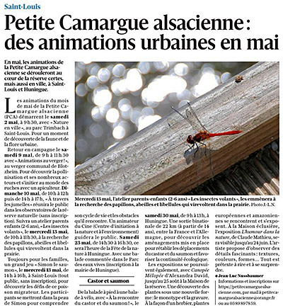 Fil d'Ariane :Accueil › Actualités › Petite Camargue alsacienne : des animations urbaines en mai Petite Camargue alsacienne : des animations urbaines en mai Publié le 29/04/2026 Actualités Article paru dans le journal l’Alsace le 29 avril 2026