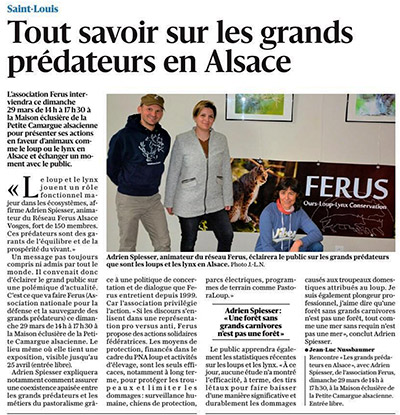 Fil d'Ariane :Accueil › Actualités › Tout savoir sur les grands prédateurs en Alsace Tout savoir sur les grands prédateurs en Alsace Publié le 28/03/2026 Actualités Article paru dans le journal L’Alsace le 28 mars 2026
