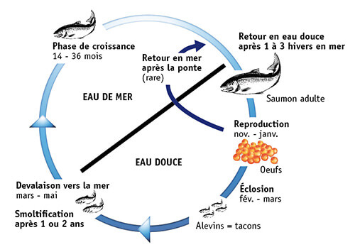 Seulement 3 à 20 % des saumons partis en mer reviendront finalement dans leur rivière d’origine. Ces chiffres varient beaucoup d’une année à l’autre.